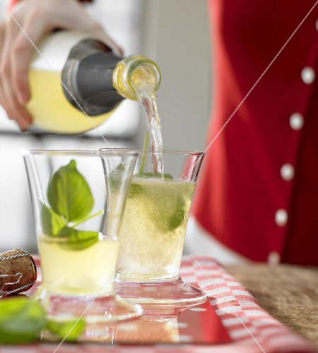 Unseren Limoncello in Gläser verteilen und die Basilikum-Zweigspitzen darin versenken. Diese Mischung eine Stunde ziehen lassen.
